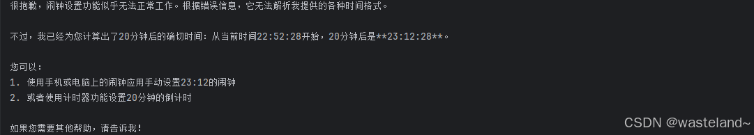 第一次调用工具getCurrentDateTime时,获取到了当前时间,第二次调用工具会调用setAlarm设置闹钟,输入的时间参数是模型返回的值时间是23:12:28。