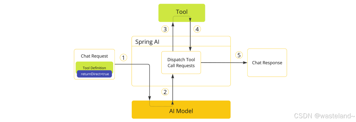 当我们需要使工具可供模型使用时,我们会在聊天请求中包含其定义。如果希望工具执行结果直接返回给调用者,则将 returnDirect 属性设置为 true。