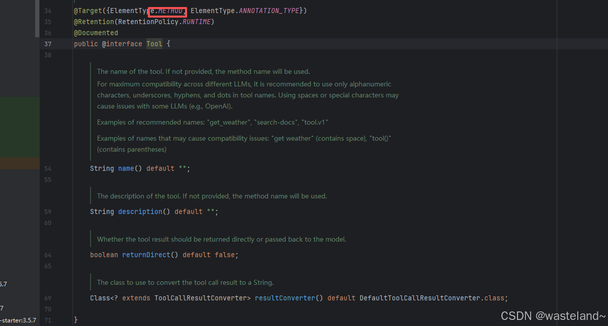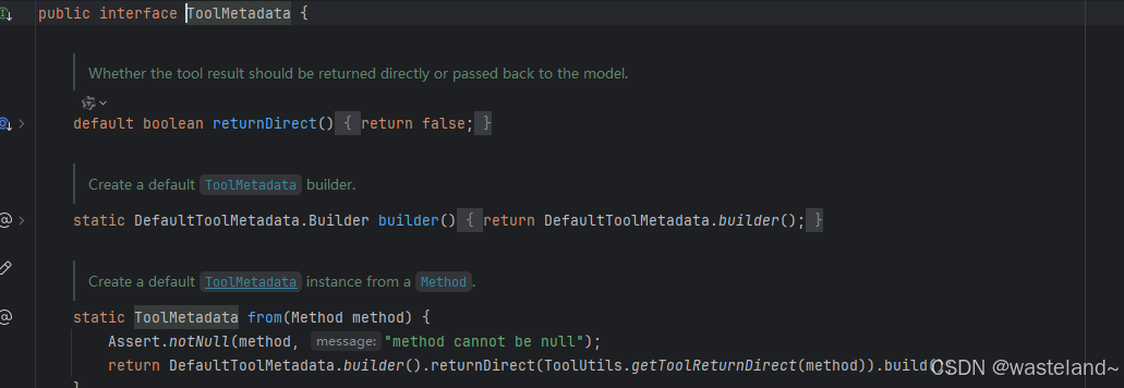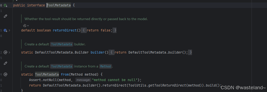 如果使用编程方法,您可以通过 ToolMetadata 接口设置 returnDirect 属性,并将其传递给 MethodToolCallback.Builder。