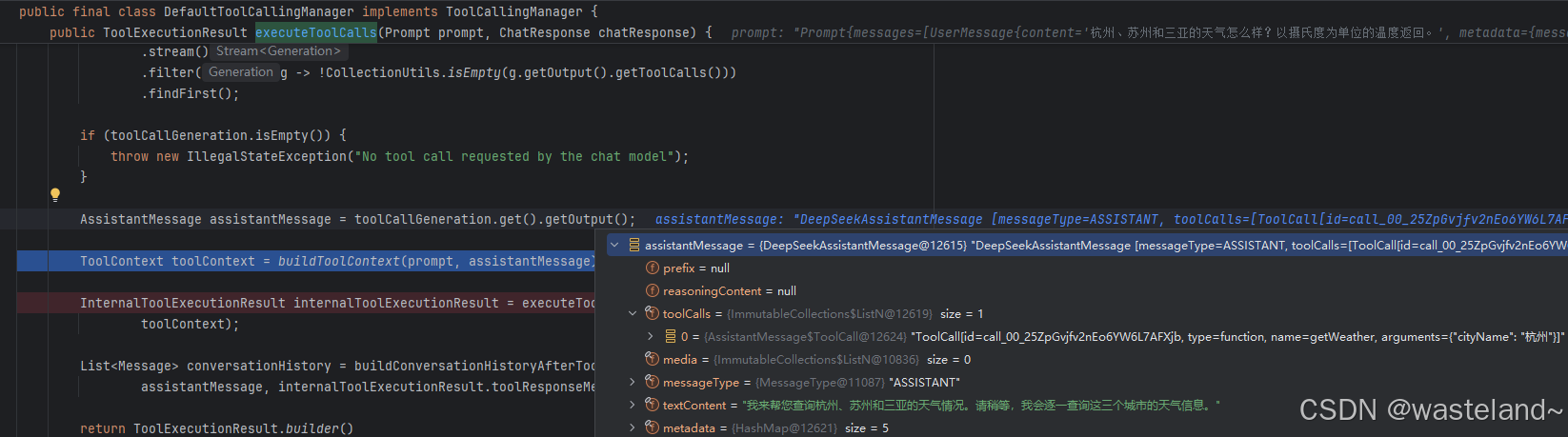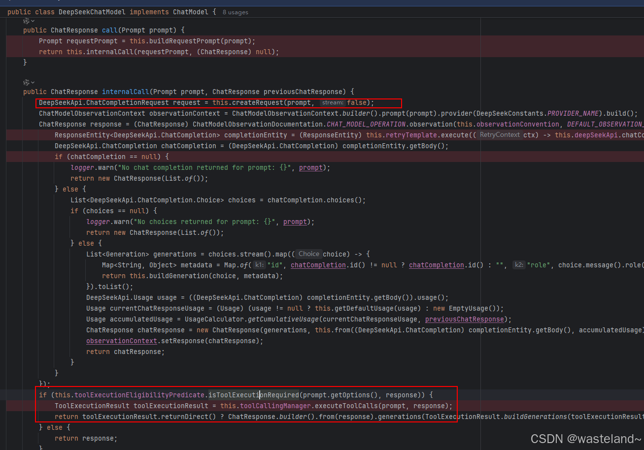 当使用默认行为时,Spring AI 将自动拦截来自模型的任何工具调用请求,调用工具并将结果返回给模型。所有这些都由每个 ChatModel 实现使用 ToolCallingManager 透明地为您完成,比如下面DeepSeekChatModel的internalCall方法内容。