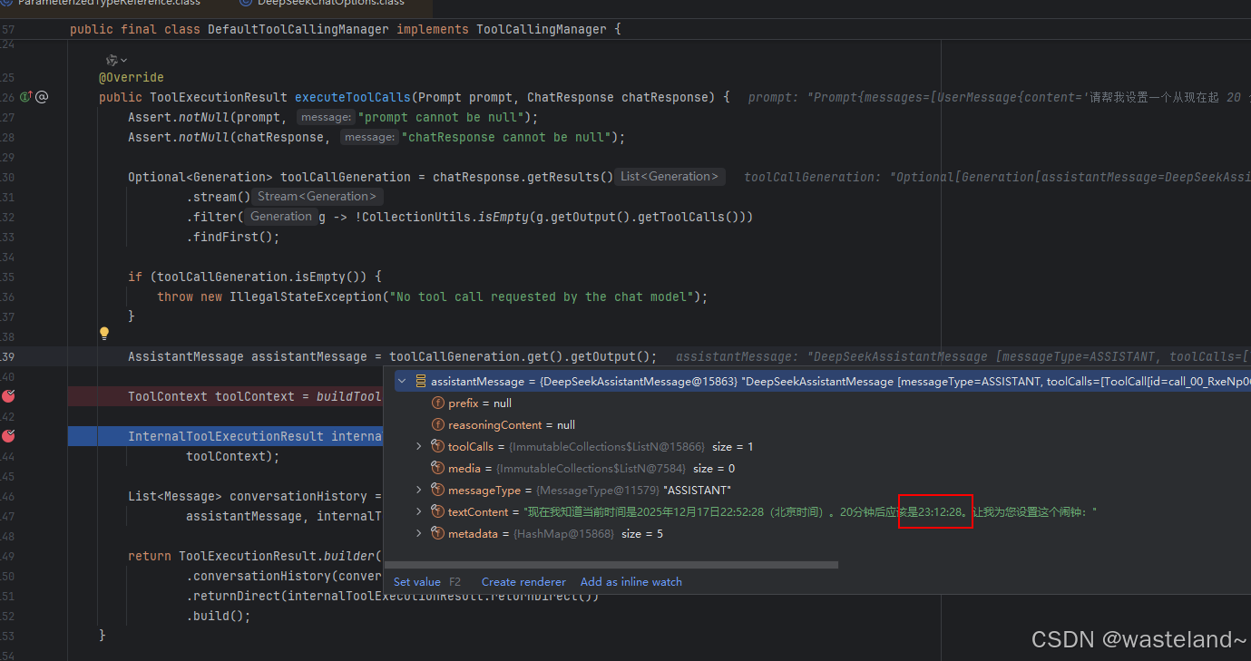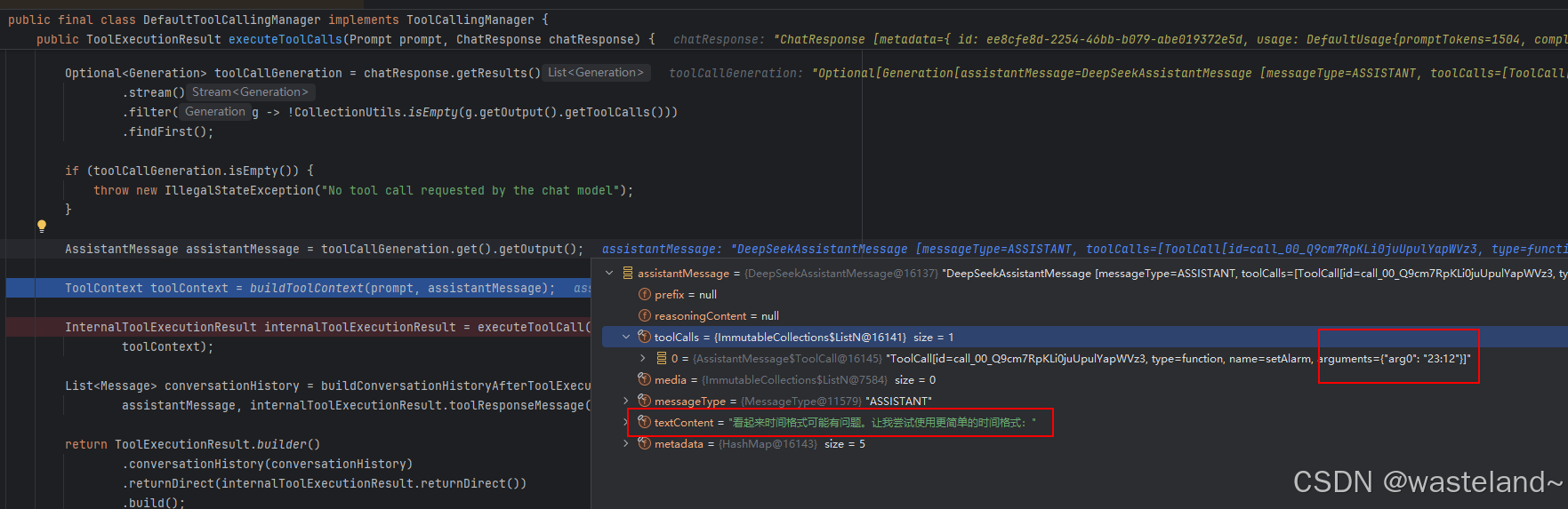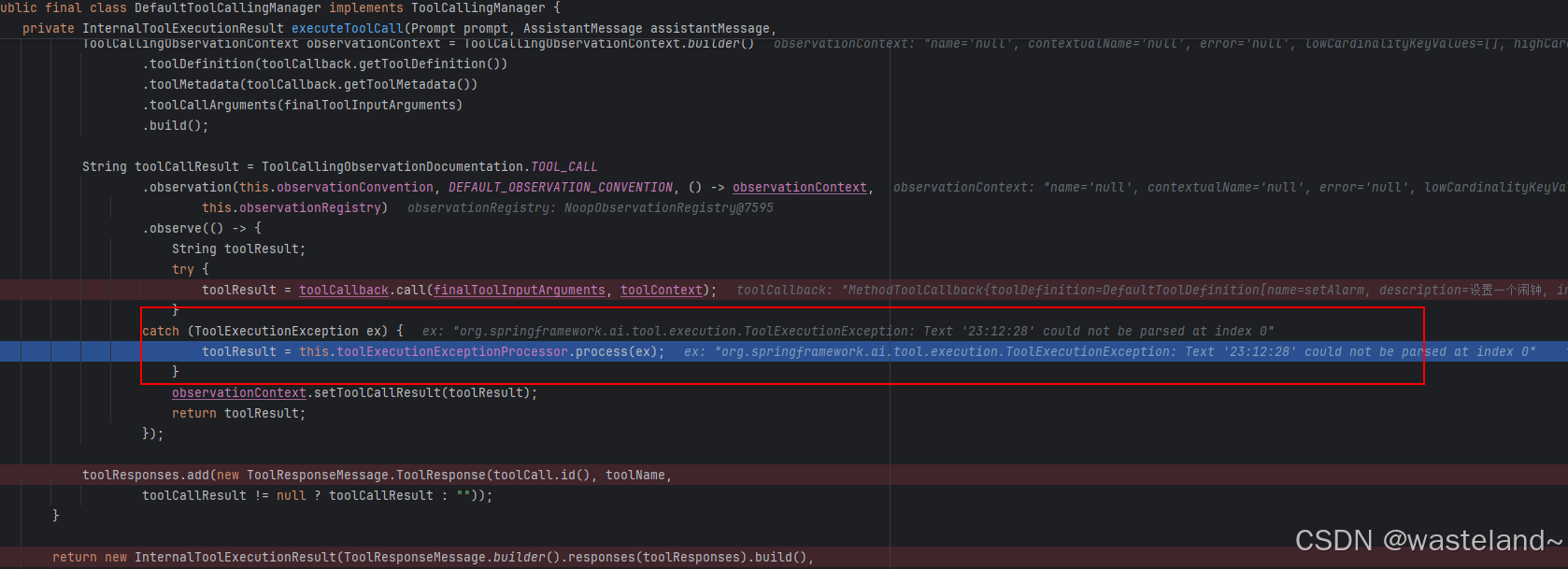 我们可以看到执行到setAlarm这个方法的工具执行时,异常被ToolExecutionExceptionProcessor类捕获处理了然后存到了工具响应里回传给了大模型。