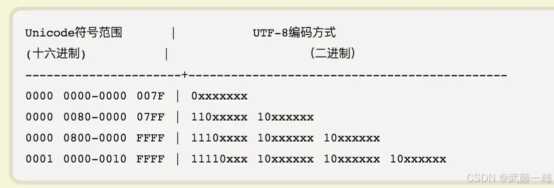 UTF-8 最大的一个特点,就是它是一种变长的编码方式。它可以使用1~4个字节表示一个符号,根据不同的符号而变化字节长度。
