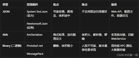 在 C# 开发中,你主要会接触到以下三种类型的序列化方式: