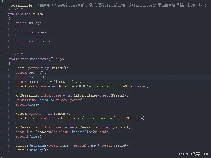 上述代码中我们在类的头部加入了 Serializable 特性,这代表着整个类对象都需要序列化,如果我们不需要序列化其中某个属性的话只需在该属性上加上 NonSerialized 特性即可。下面我们来看一下序列化和反序列化的代码: