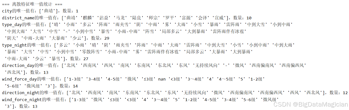 离散特征统计结果显示city仅为"曲靖",district_name含多个区县;type_day/night有晴、多云、小雨等十余种取值,wind_force_day/night存在"1-2级、微风、≤3级"等不规范表述,直接支撑后续天气类型简化、风力等级标准化的需求;若缺失目标列,会即时提示异常。