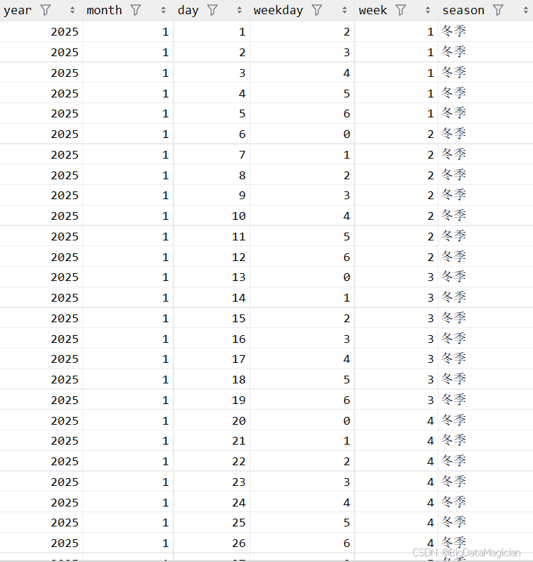 预处理后的部分数据如下图所示,处理后的数据集规整性显著提升,天气类型、风力等级完成标准化,温度去除单位转为纯数值;新增年、月、季节、温差等特征。数据保留核心信息且更易分析,可直接用于天气特征统计、时间维度分析等后续工作。