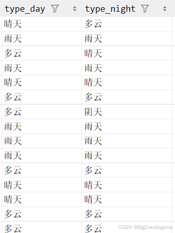 处理后部分数据如下图所示,从处理后的数据能看到,原本细分的天气表述(比如 "晴""阴"),现在统一成了 "晴天""雨天" 等大类。简化后的天气类型更简洁规整,既保留了天气的核心属性,又避免了细分类型过多带来的分析冗余,方便后续统计不同天气类别对应的温度变化、出现频率等分析工作。