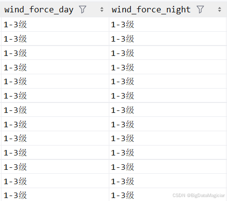 处理后部分数据如图所示,从处理后的数据能看到,原本不同表述的风力(比如 "1-2 级""微风"),现在都统一成了 "1-3 级" 这样的标准等级。标准化后的风力等级更规整,既保留了风力的核心区间信息,又避免了表述混乱带来的分析干扰,方便后续统计不同风力等级对应的天气、温度等关联特征。