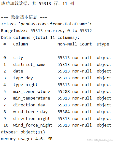 成功加载则输出68103行11列,直观呈现数据规模;失败则精准提示错误原因(文件不存在/格式错误等),快速定位问题。数据基本信息结果显示所有列均为object类型、无缺失值,明确后续需将日期列转datetime、温度列转数值型,且无需处理空值。