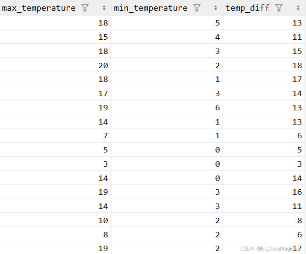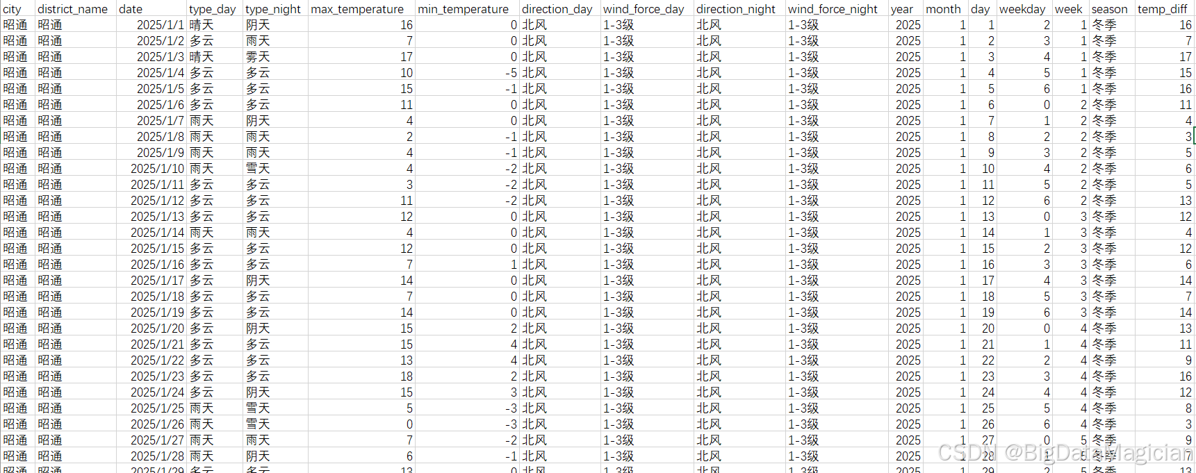 处理后数据如下图,从处理后的数据能看到,原本带 "℃" 的温度值(如 "19℃"),现在已转为纯数字格式。统一格式后的温度数据更便于后续计算(比如统计月均温),而温差的隐含信息也被提取出来,能直接用于分析不同天气下的温度波动情况。