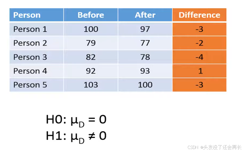 We'll hear use some example data on weights in kilos before and after five individuals have tried a new diet for 3 weeks the differences in weight before and after are shown in last column.