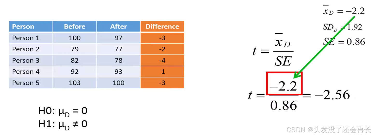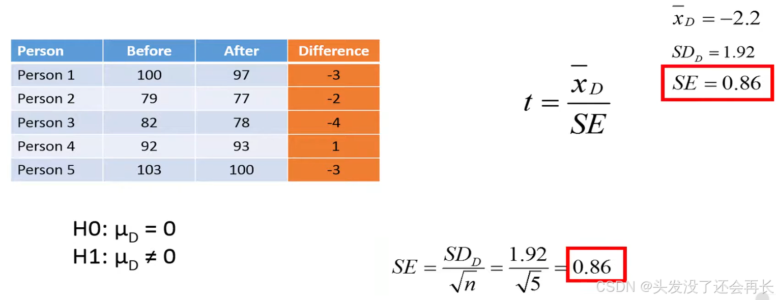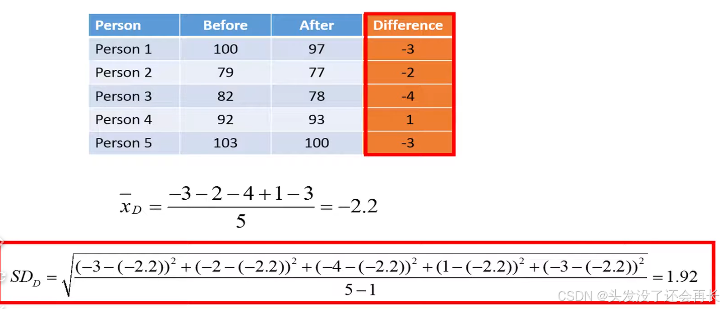 We then calculate the mean of these differences we see that on average the five individuals have lost 2.2 kilos of their diet let's also calculate the standard deviation of the differences which in this case results in a value 1.92.
