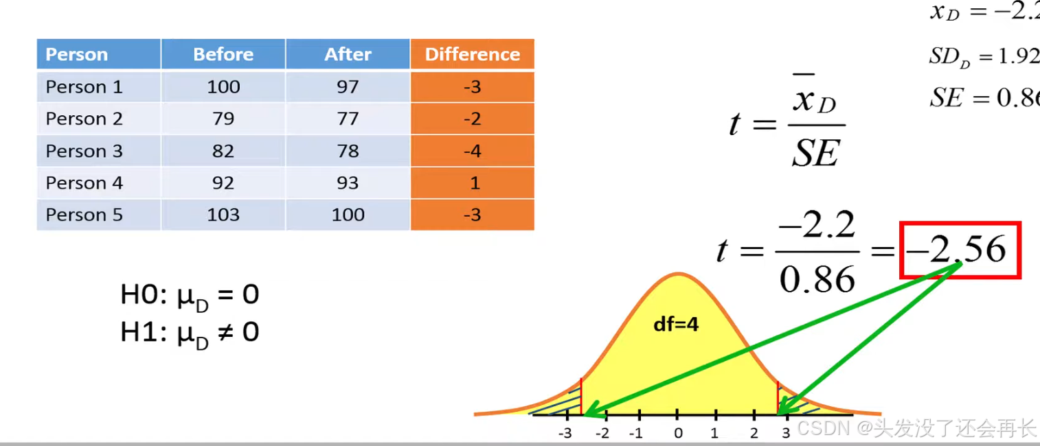 We use freedom degree=5-1=4. we get the area on t-distribution of df=4, and the p-value = area = 0.063. Because 0.063>0.05, so we do not reject the null hypothesis, we conclude that the diet has no significant effect on the body weight.