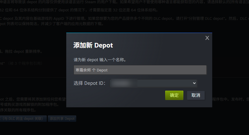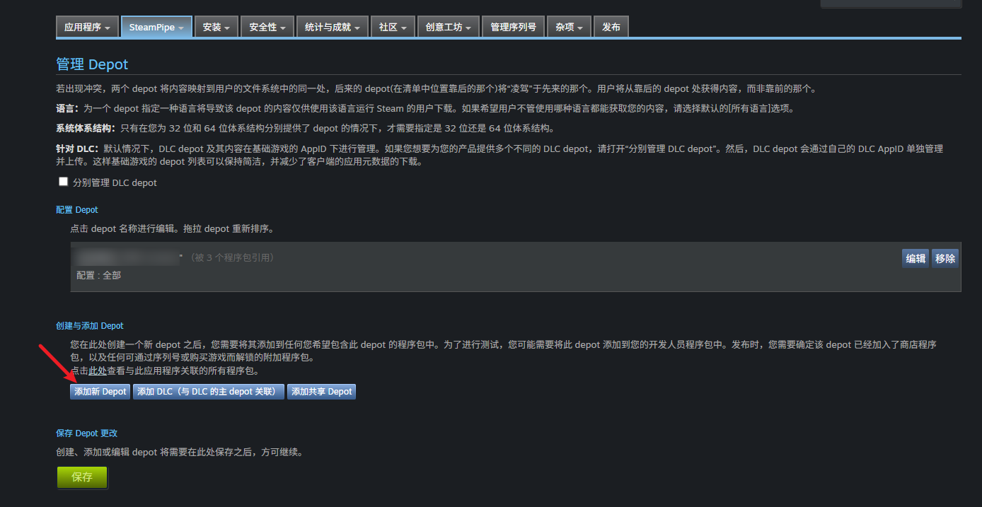- [5、添加depot的名称和选中depotID,这个depotid默认是比appid+1的,比如你的appid是480,depotid就应该是481,然后点击保存 ,这里的depot就设置完成了。](#5、添加depot的名称和选中depotID,这个depotid默认是比appid+1的,比如你的appid是480,depotid就应该是481,然后点击保存 ,这里的depot就设置完成了。)