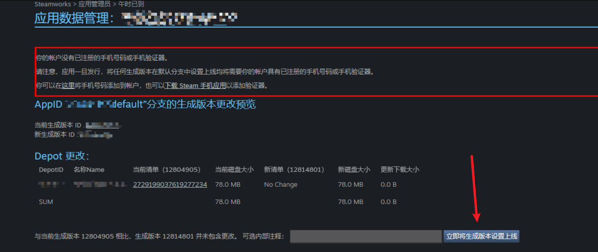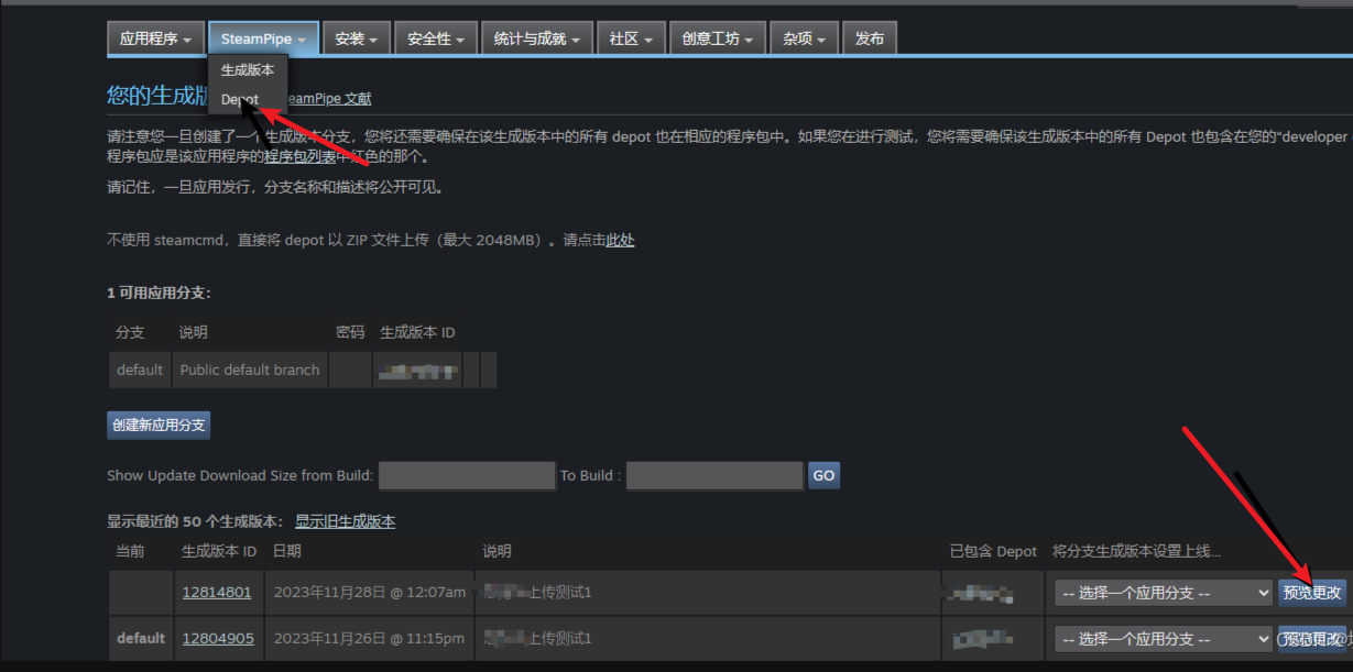 1、找到Steamworks管理员,然后找到SteamPile,点击生成版本,我们可以看到刚刚上传然后生成的版本,这里已经上传过很多次了,因此你第一次上传的话应该是只有一个的,点击default分支,点击预览更改