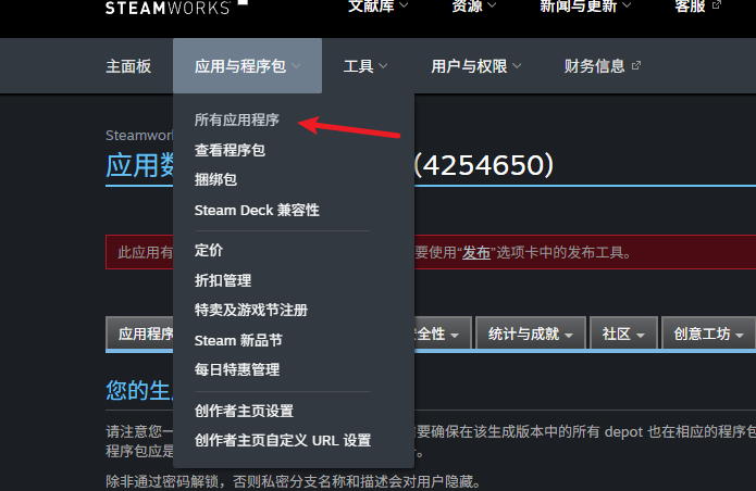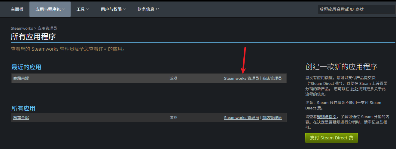 - 2、找到你在Steam上花100美元申请的AppID的应用程序,点击Steamworks管理员