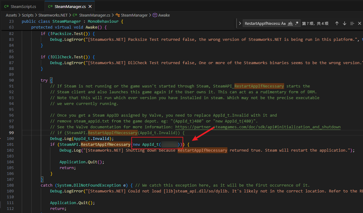 找到SteamManager.cs 中的SteamAPI.RestartAppIfNecessary并修改为SteamAPI.RestartAppIfNecessary(new AppId_t(你的appid))