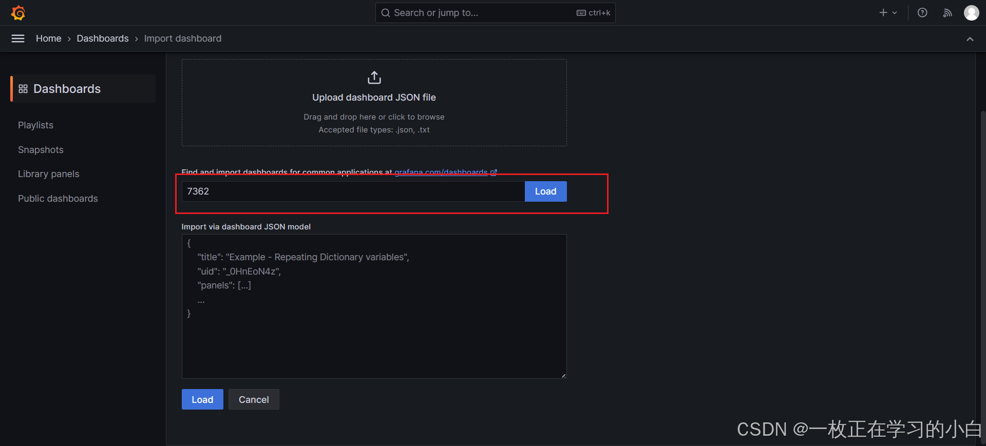 grafana配置参考上一章节内容。导入的Dashboard从grafana官方获取,ID为7362