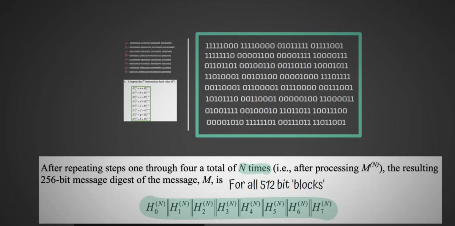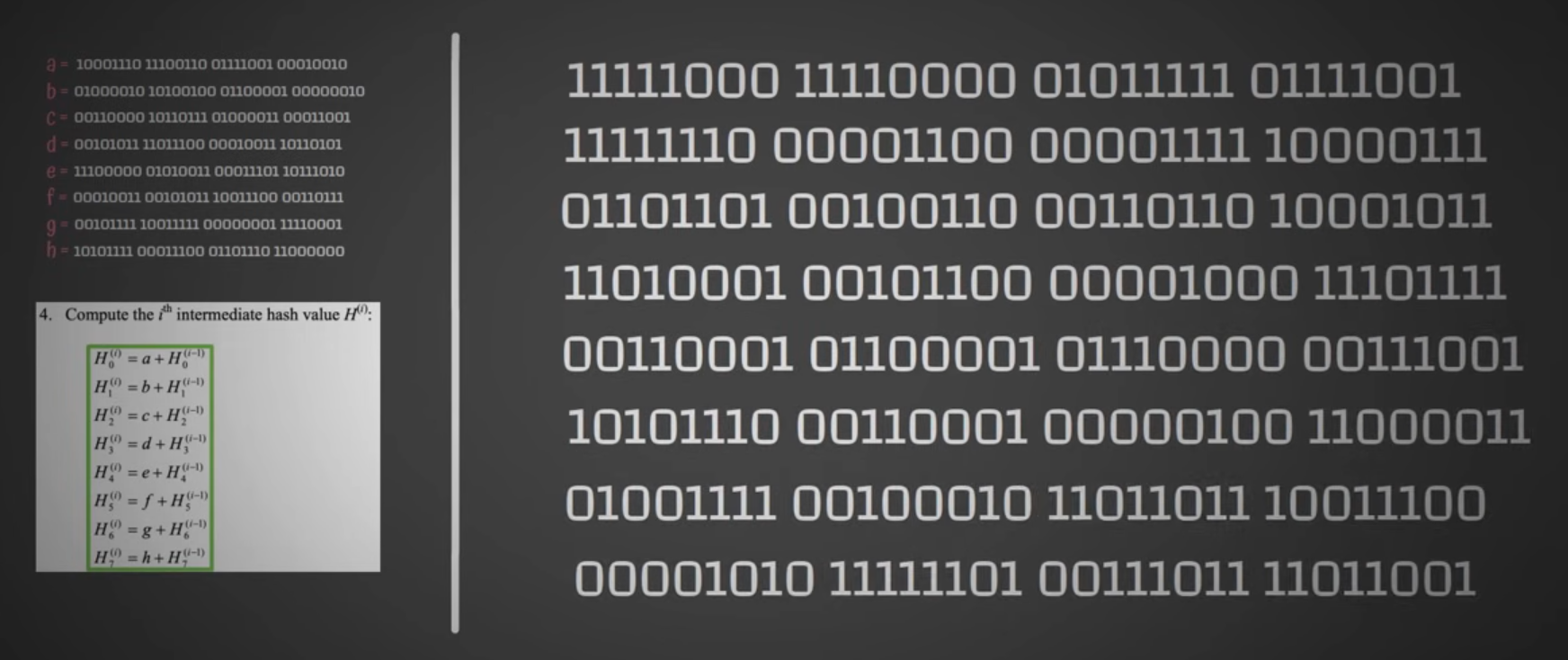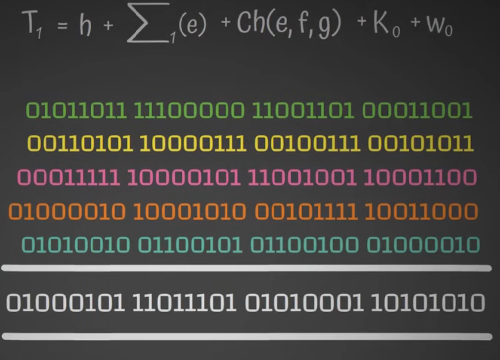 把所有32位的H合并成256位,就是最终我们例子"**RedBlockBlue"**的SHA256的值了