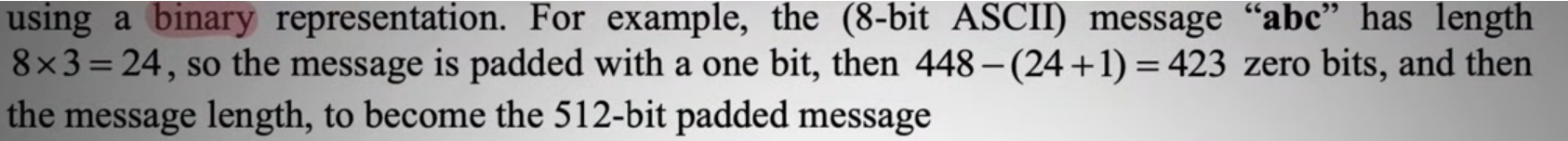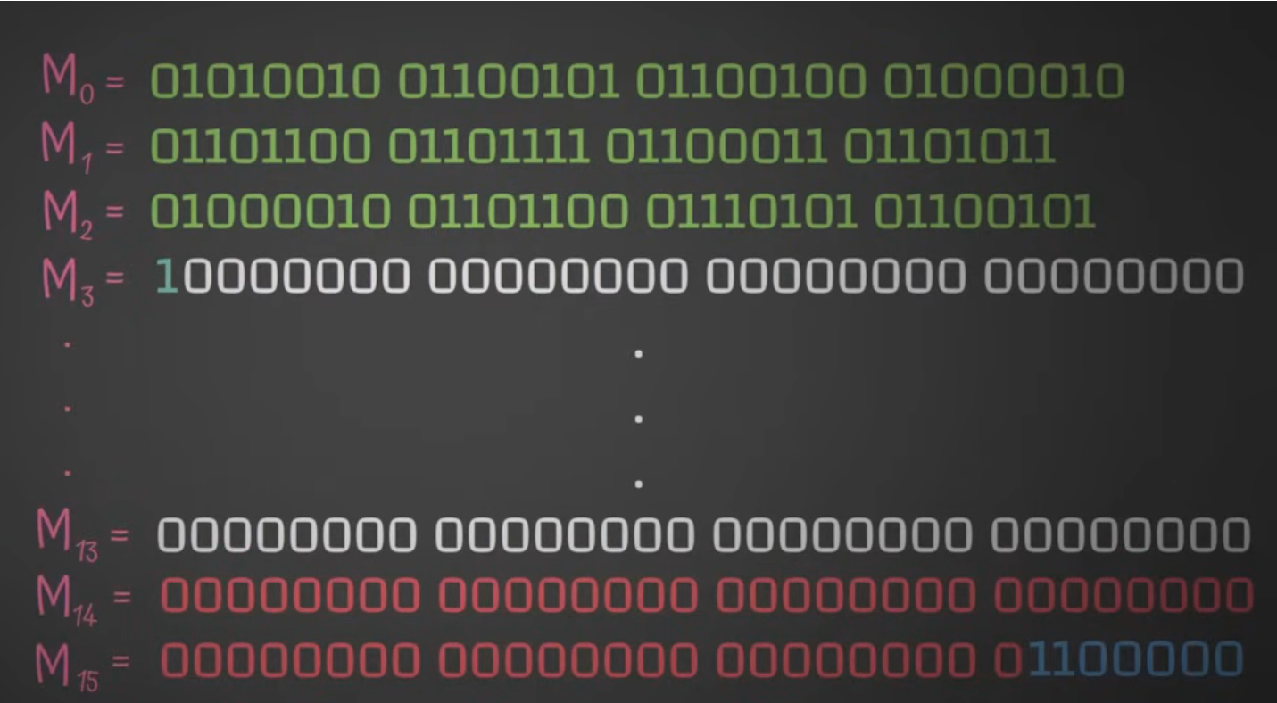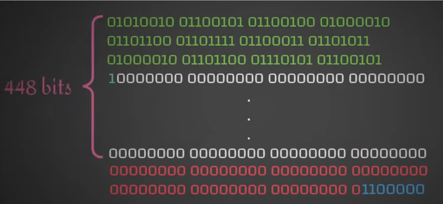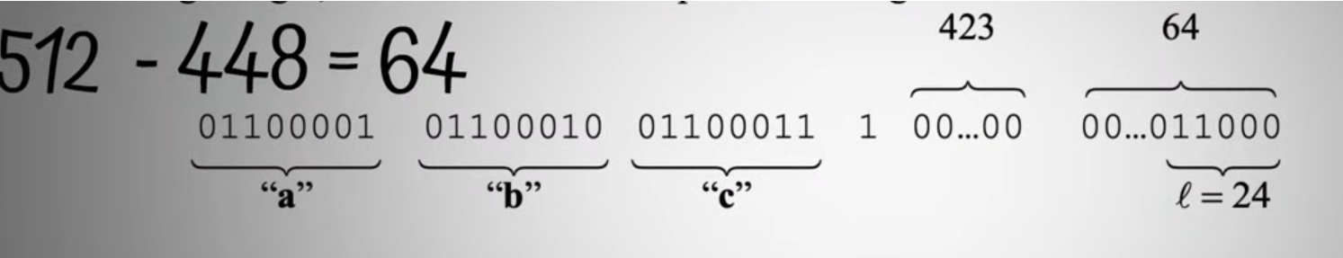 在输入末尾添加一个1,然后不停添加0,直到距离512的倍数还差64bit: 512-448=64