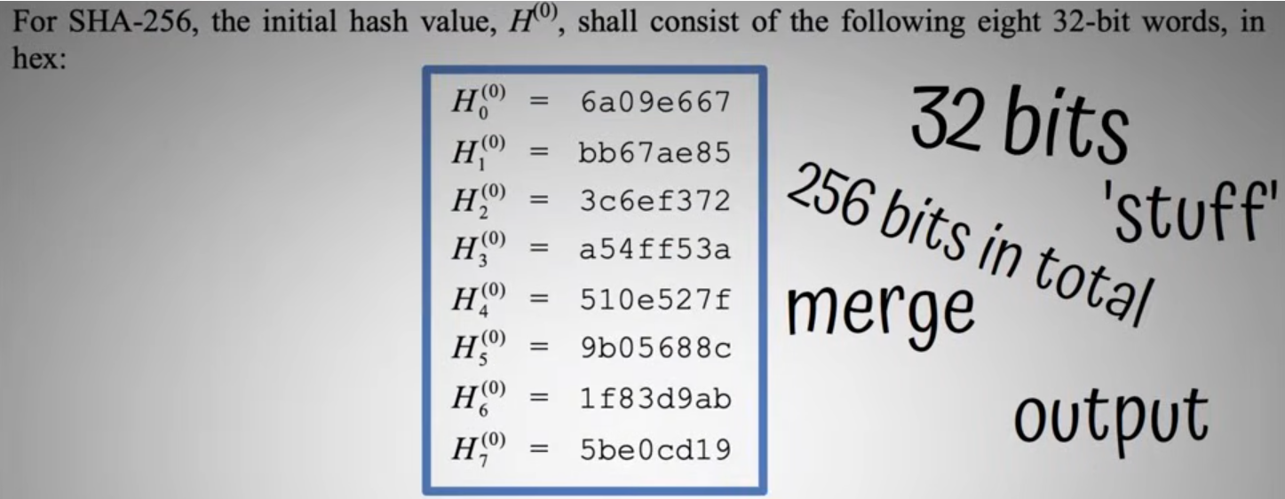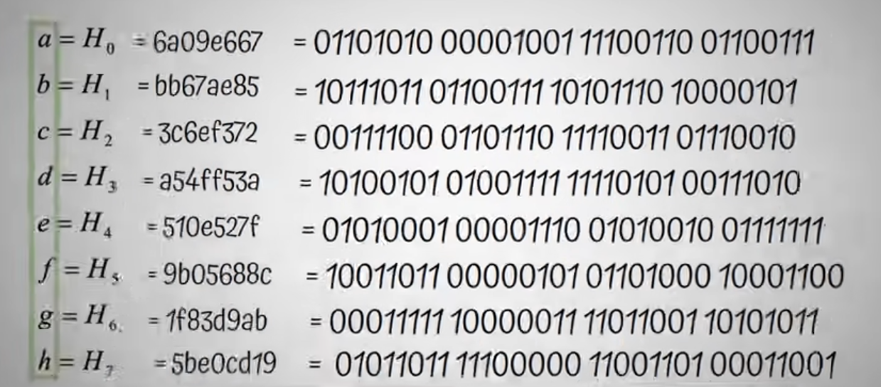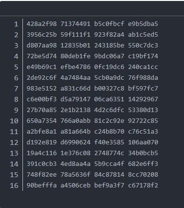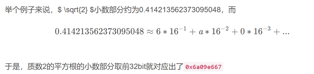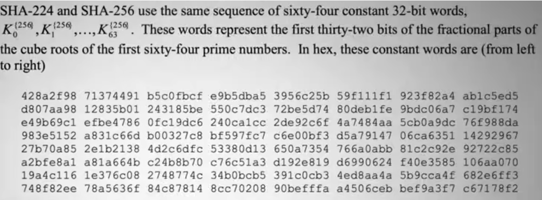 和8个哈希初值类似,这些常量是对自然数中前64个质数(2,3,5,7,11,13,17,19,23,29,31,37,41,43,47,53,59,61,67,71,73,79,83,89,97...)的立方根的小数部分取前32bit而来