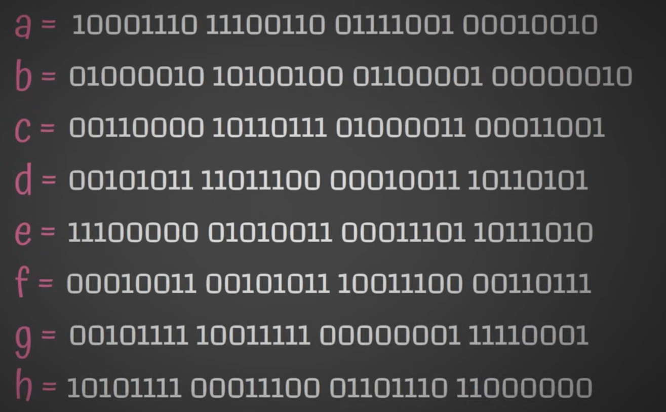 总共有八个,每个哈希值32bits,也就是总共256bits