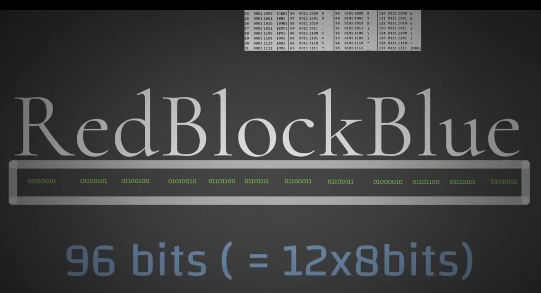 以输入"**RedBlockBlue"**为例,它对应的二进制码是: