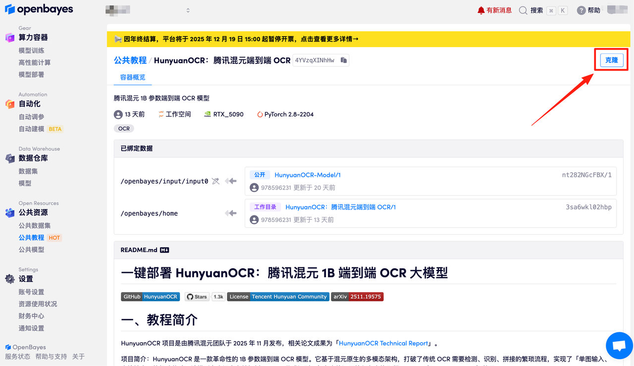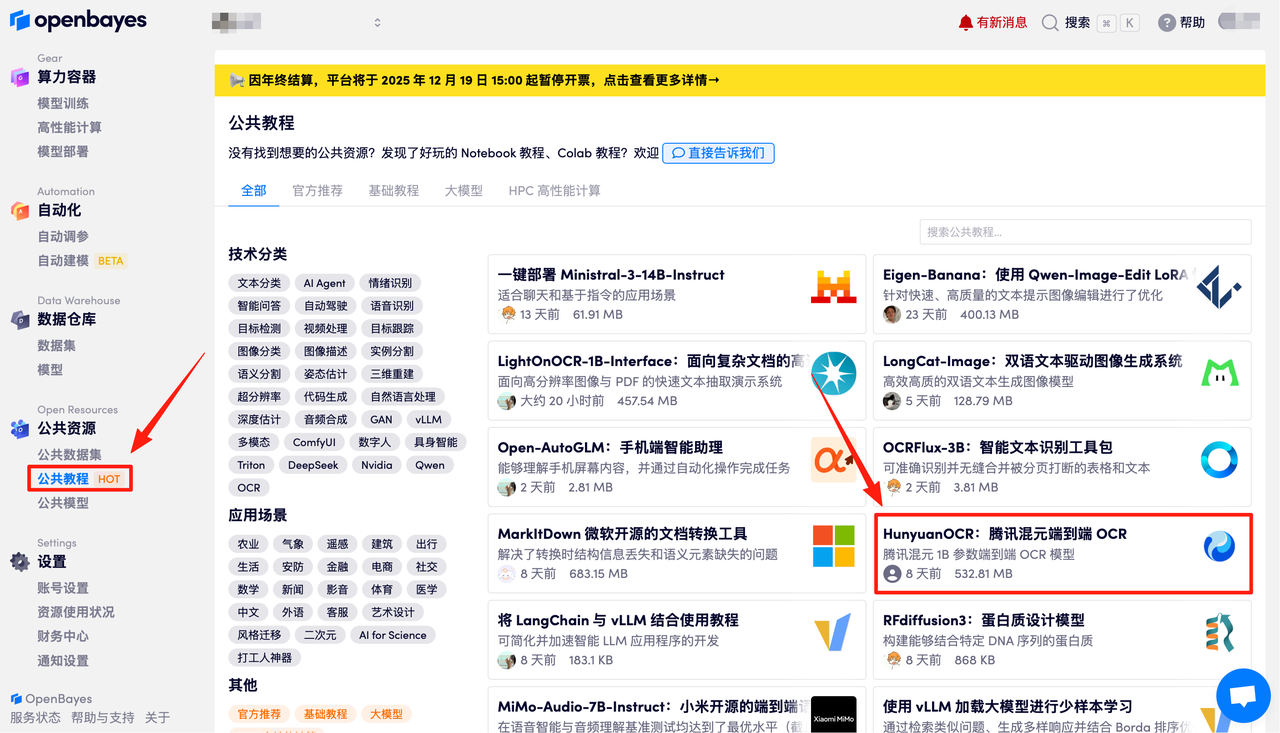 首先点击「公共教程」,找到「HunyuanOCR:腾讯混元端到端 OCR」,单击打开。