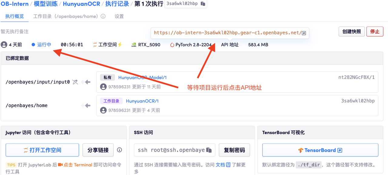 数据和代码都已经同步完成了。容器状态显示为「运行中」后,点击「API 地址」,即可进入模型界面。