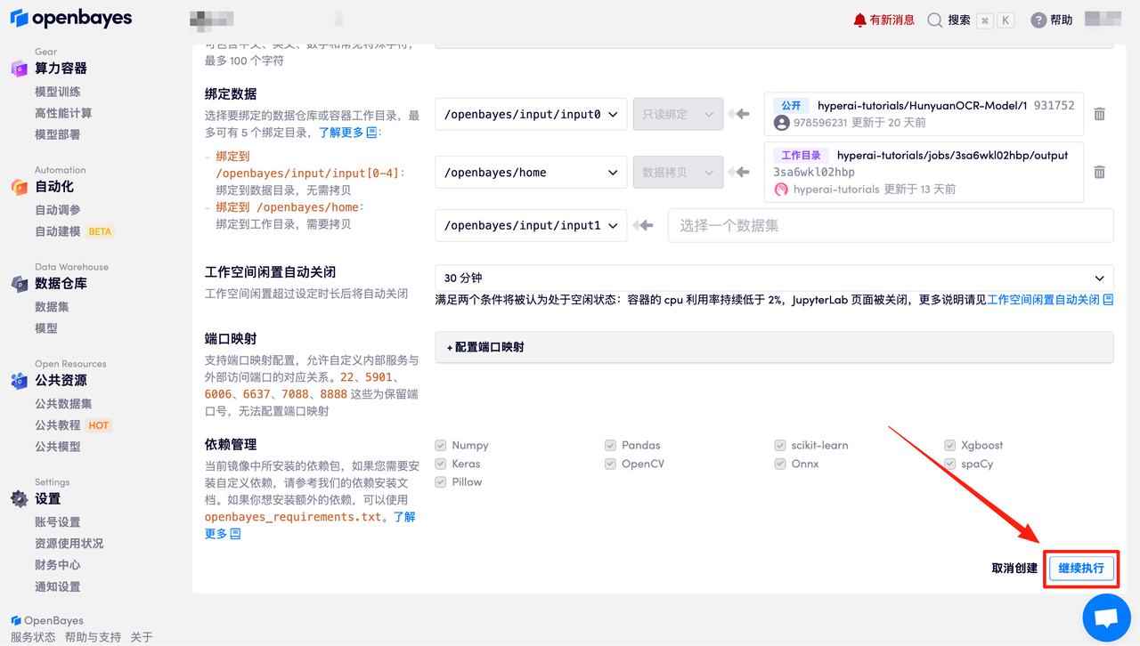 在当前页面中看到的算力资源均可以在平台一键选择使用。平台会默认选配好原教程所使用的算力资源、镜像版本,不需要再进行手动选择。点击「继续执行」,等待分配资源。