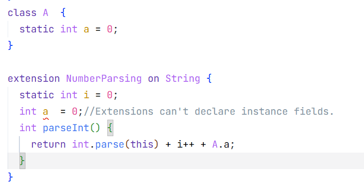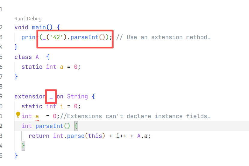 扩展不仅能定义方法,还可以定义其他成员,例如 getter、setter 和运算符。此外,扩展可以拥有名称,这在出现 API 冲突时非常有用。以下是通过一个作用于字符串的扩展(名为 NumberParsing)来实现扩展方法 parseInt() 的方式: