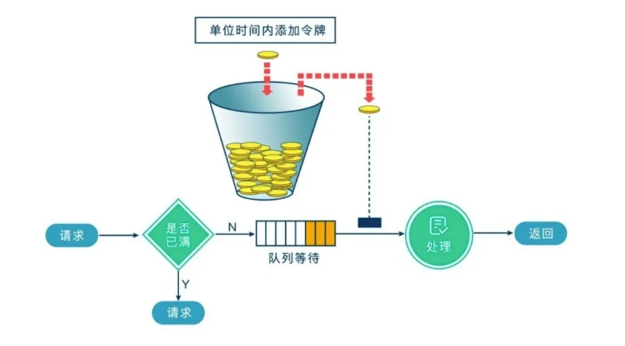 - 漏桶算法(Leaky Bucket):以固定速率处理请求,超出部分丢弃或排队