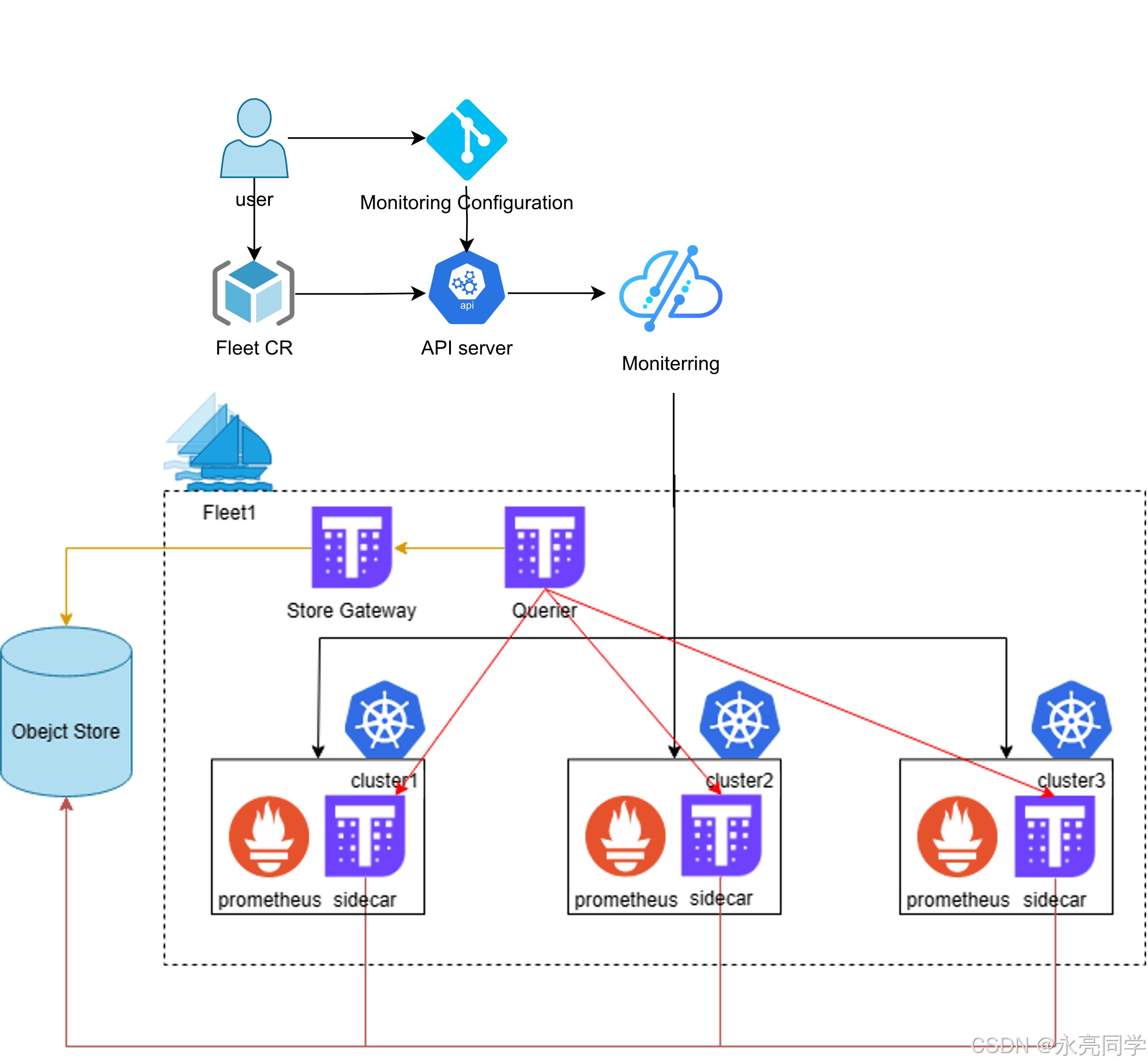 Kurator 官方文档中,统一监控基于 Prometheus + Thanos,并通过 Fleet 插件统一启用。