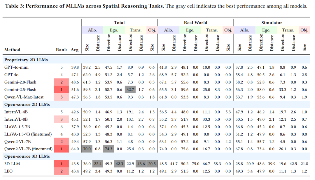 相对关系推理优于绝对测量:所有模型在判断"谁更高""谁在左边"等相对关系时表现较好,但在测算具体距离时准确率仅4.1%;