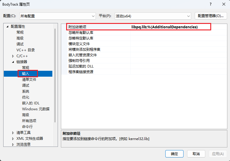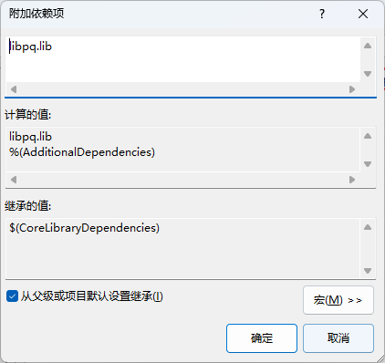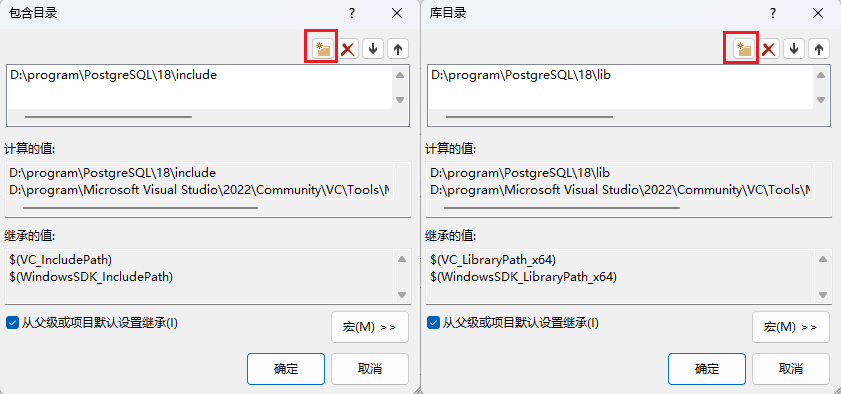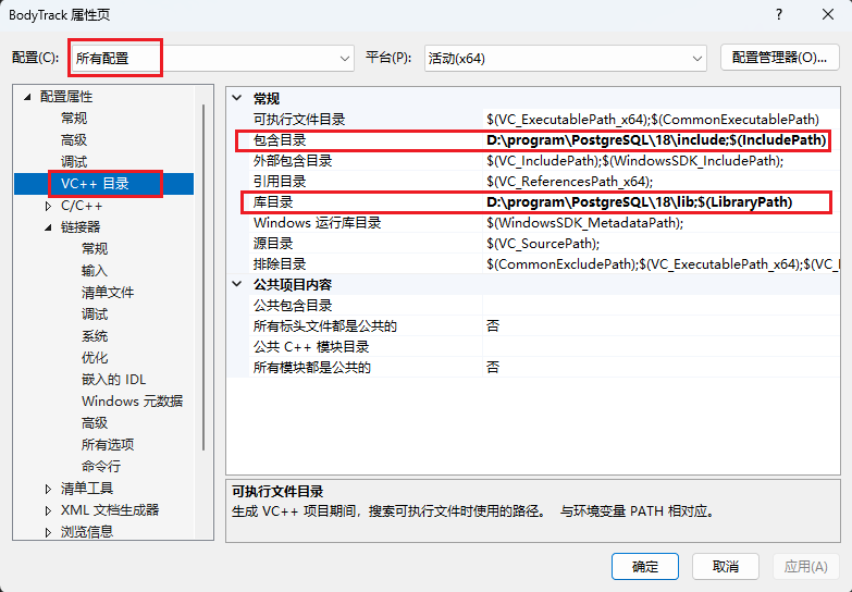 选择配置属性 下的VC++目录 ,分别点击包含目录 和库目录 ,下拉之后选择编辑,分别添加 PostgreSQL安装目录\{version}\include 目录和 PostgreSQL安装目录\{version}\lib 目录。