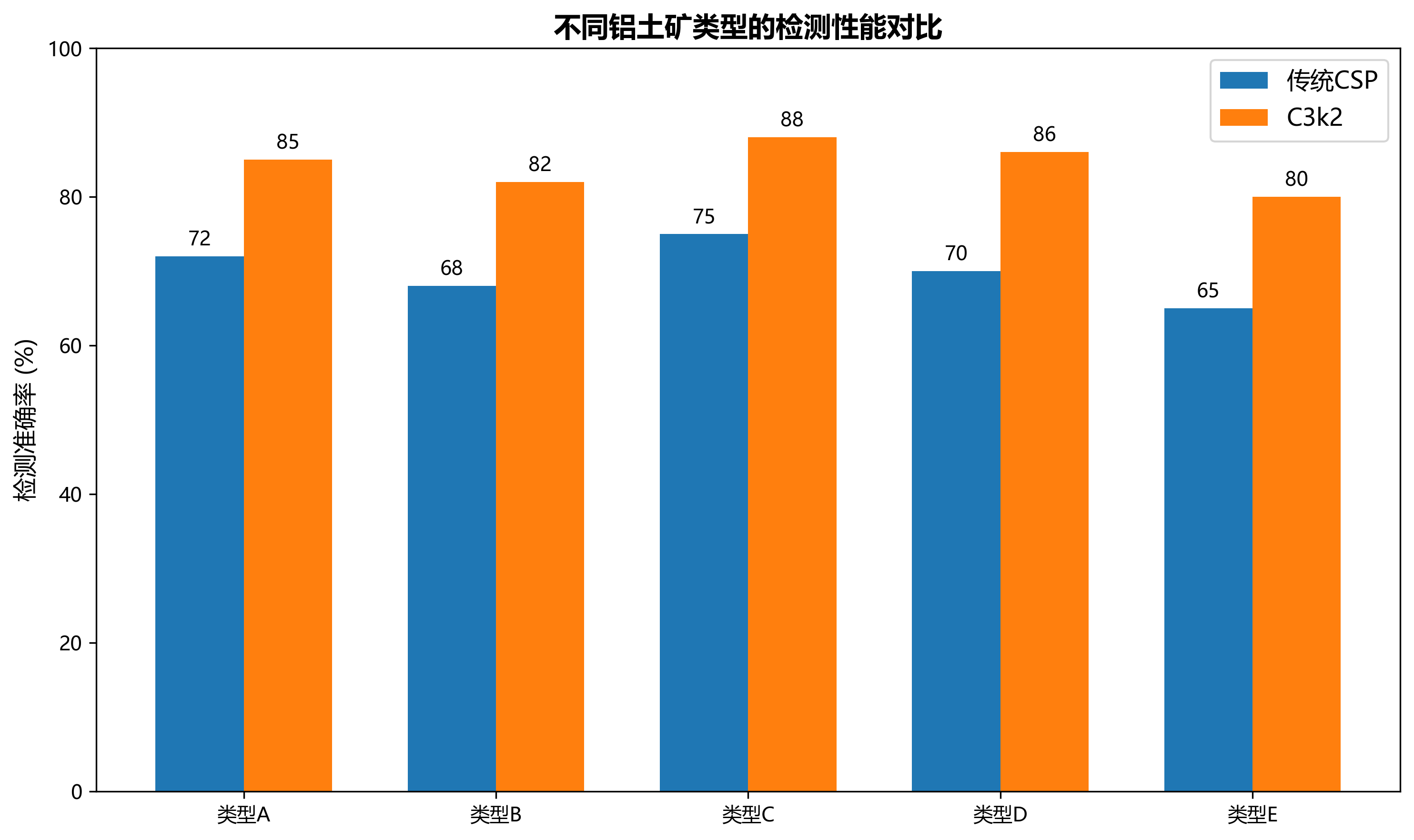在铝土矿检测任务中,C3k2模块的优势主要体现在: