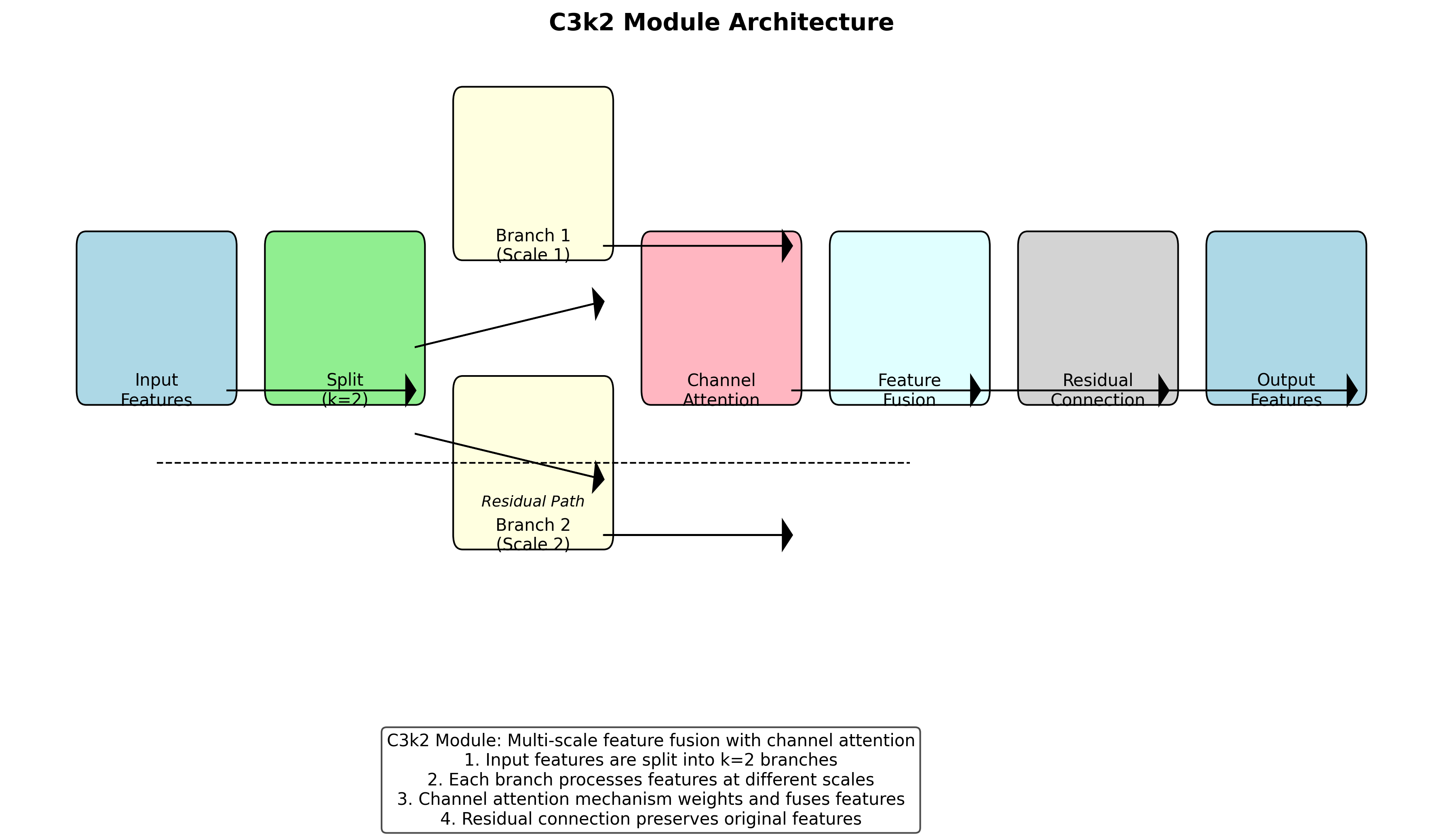 C3k2模块是我们在原始C3模块基础上的改进版本,主要创新点在于引入了多尺度特征融合和通道注意力机制。具体来说,C3k2模块将输入特征图分成k=2个分支,分别进行不同尺度的卷积操作,然后通过通道注意力机制对两个分支的特征进行加权融合,最后将融合后的特征与原始特征进行残差连接。