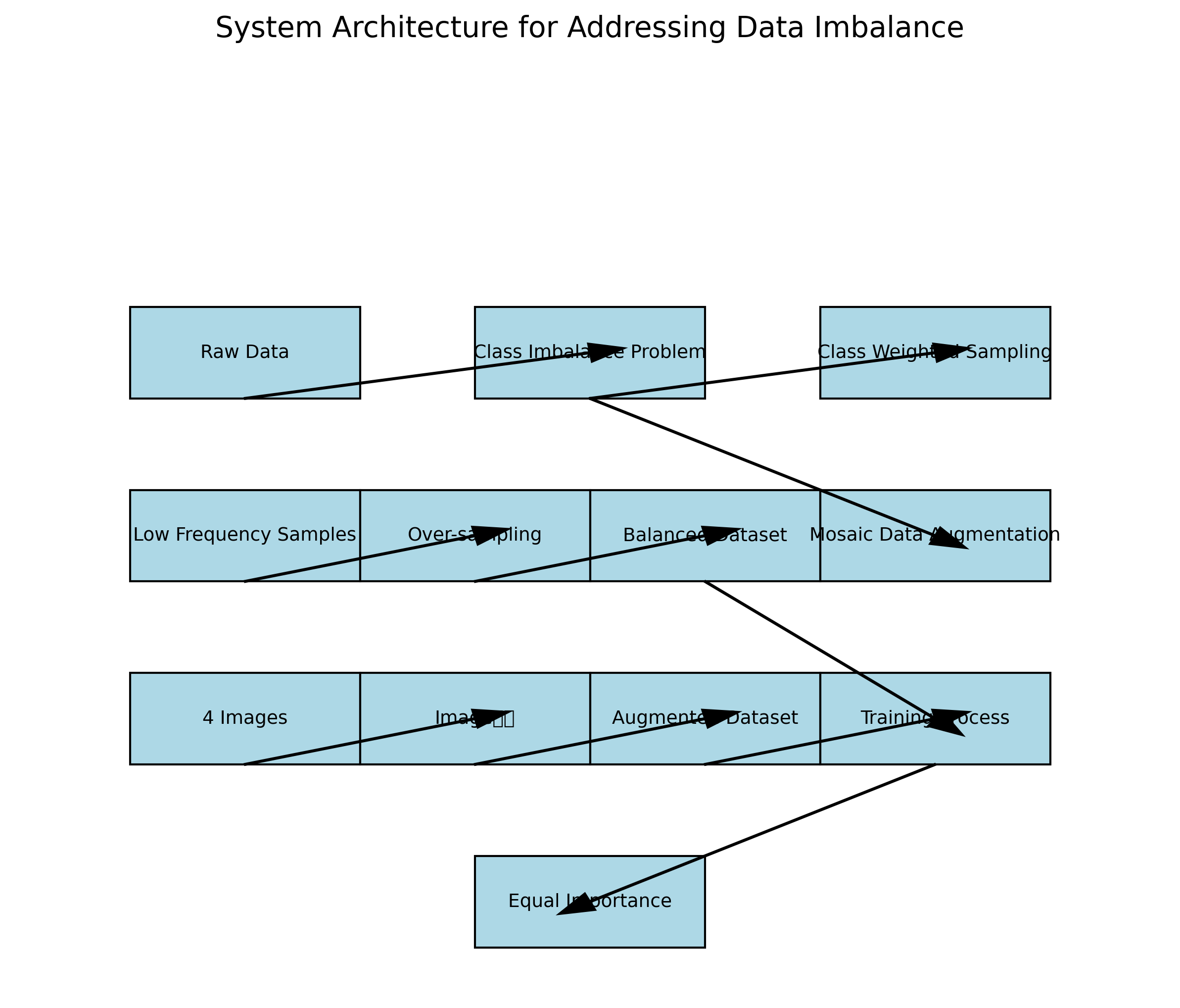 为了解决数据不平衡问题,我们采用了类别权重采样策略,对低频类别的样本进行过采样,确保每个类别在训练过程中具有相同的重要性。此外,我们还采用了Mosaic数据增强技术,将4张图像拼接成一张新图像,进一步丰富了数据集的多样性。