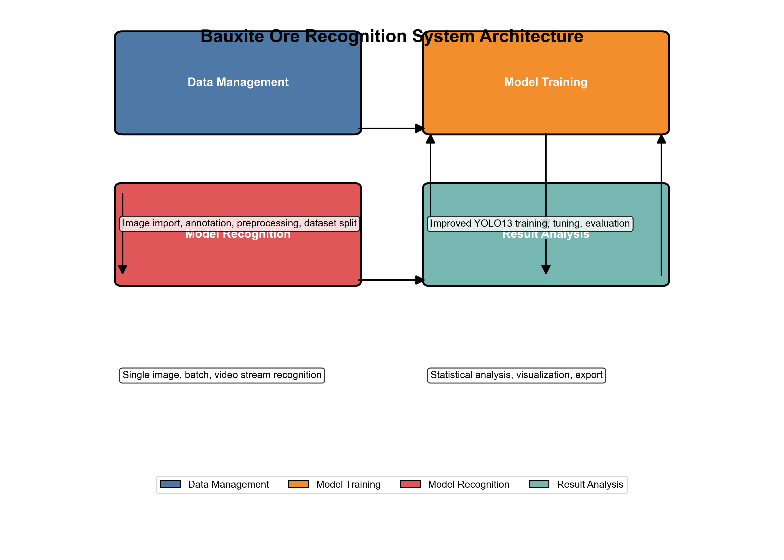 系统采用深度学习模型为核心,结合图像预处理、模型推理、结果展示等功能模块,构建完整的铝土矿智能识别流程。