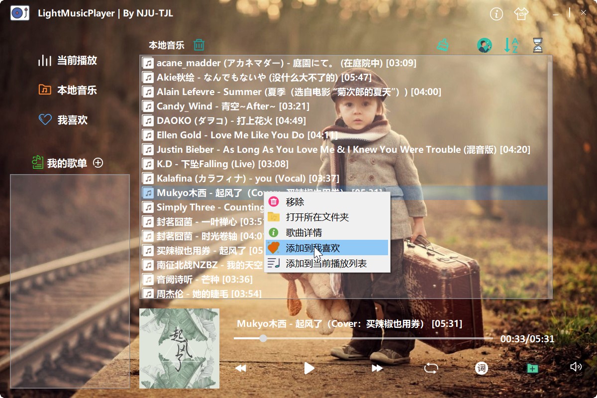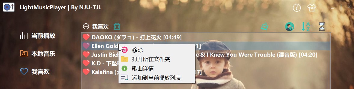 在本地音乐和当前播放列表中,右键点击某歌曲,可以弹出右键菜单。