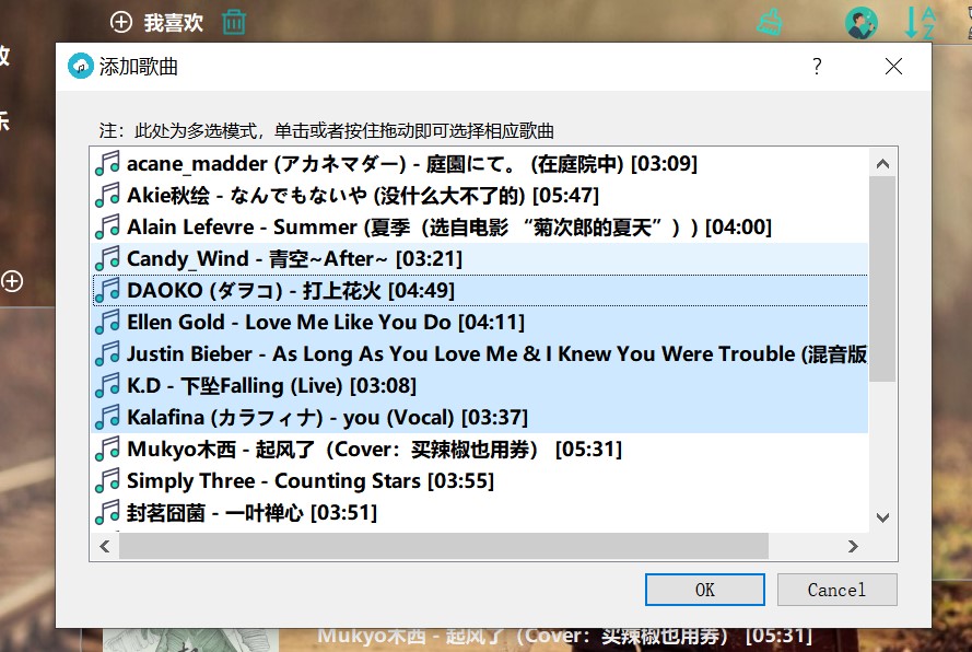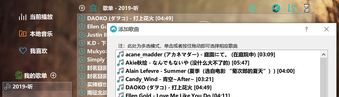 点击我喜欢左侧的加号,可批量从"本地音乐"中添加歌曲。弹出如下的对话框。