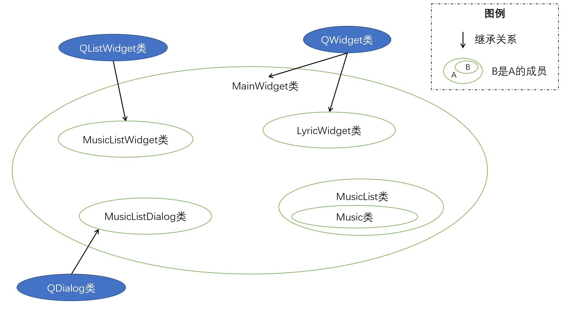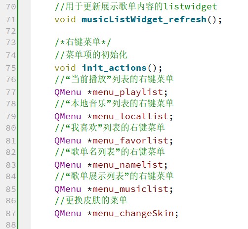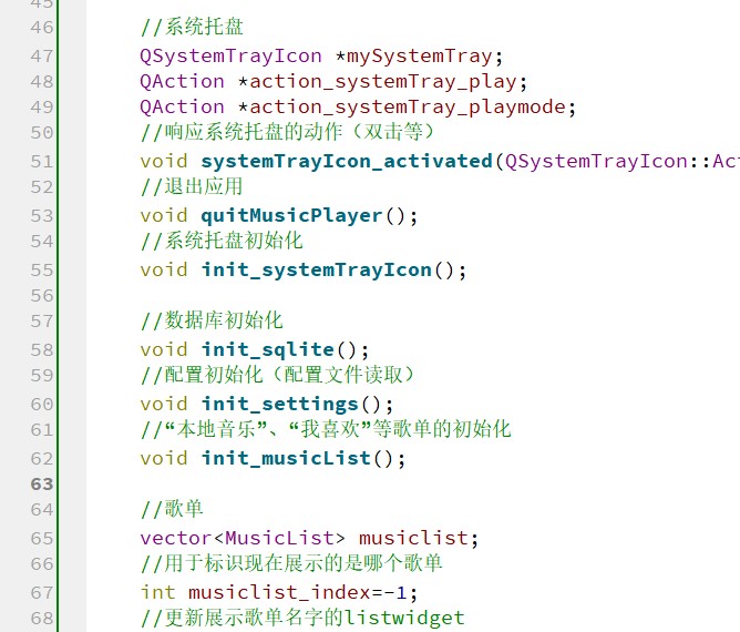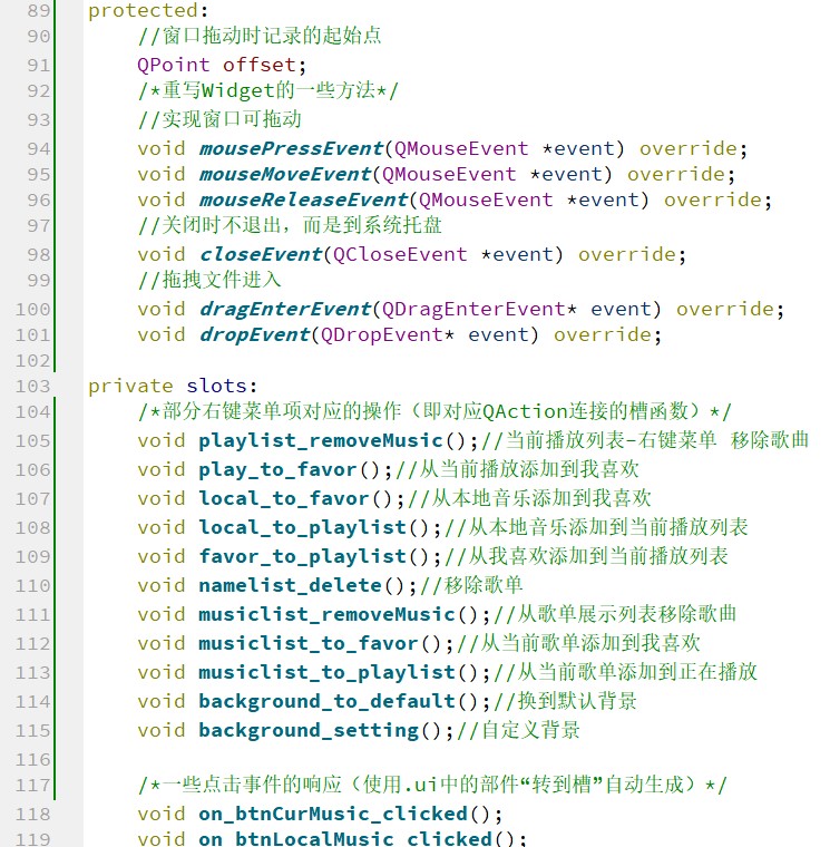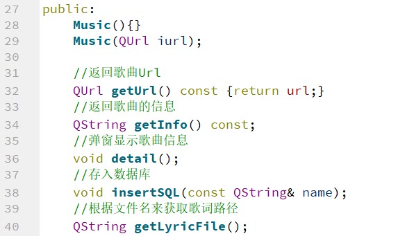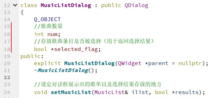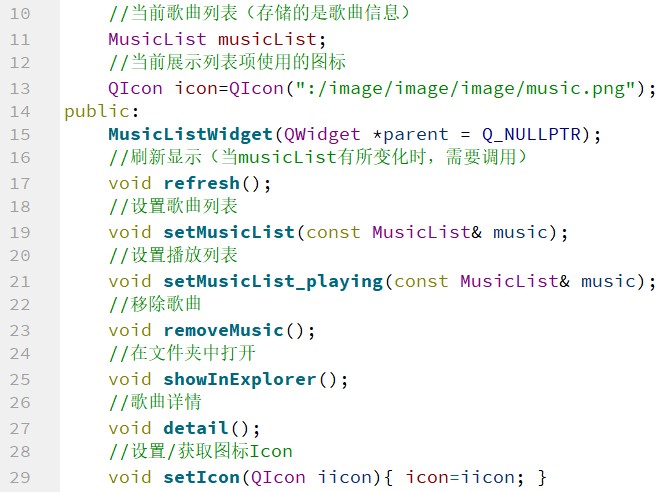 以列表形式展示歌曲时,会用到 Qt 中的 QListWidget 组件,而直接使用 QListWidget 组件因为没有结合 MusicList 这个数据结构,所以不太方便管理。因此,MusicListWidget 继承了 QListWidget,它在类中包含 MusicList 类,这样可以将 MusicList 中的歌曲信息方便地可视化展示出来,并且可以方便地对展示出来的歌曲进行管理。