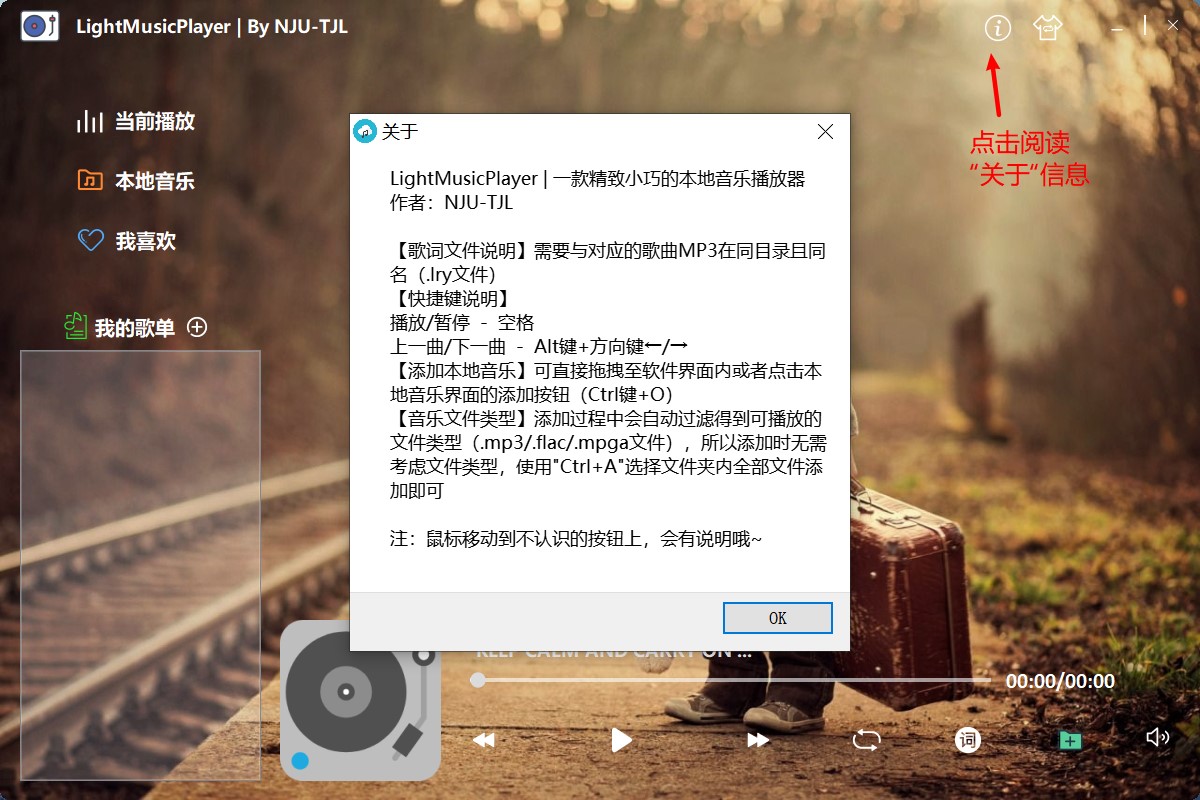 第一次运行后,会在同目录下产生两个文件:a)Music.db 文件。SQLite 本地数据库文件,存储已添加到播放器的歌曲的信息;b)LightMusicPlayer.ini 文件。保存用户设置信息,即如果设置了自定义背景图片,会在此配置文件中记录下图片文件的路径。