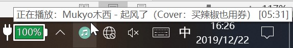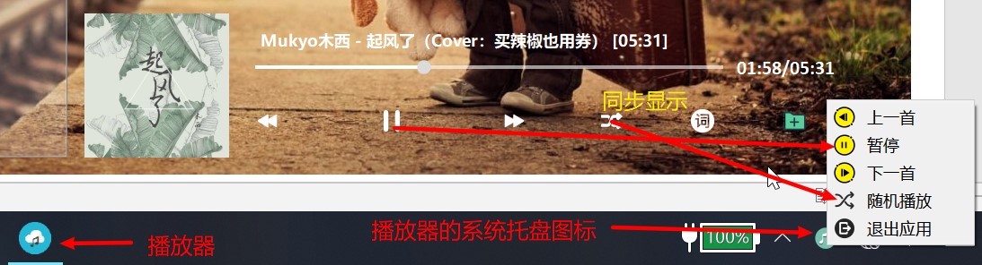 主窗口关闭后,并不会退出播放器,而是最小化到了系统托盘。系统托盘实时显示正在播放的歌曲,且可通过右键菜单控制播放。