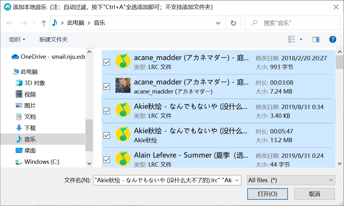 点击右下方绿色的按钮(或者使用快捷键"Ctrl+O"),可添加本地音乐。在弹出的窗口中,进入存放音乐文件的目录下,按下"Ctrl+A"全选,再点击打开即可完成添加(此过程中会自动过滤掉不支持播放的文件类型,所以此时用户不用手动筛选添加文件的类型)。