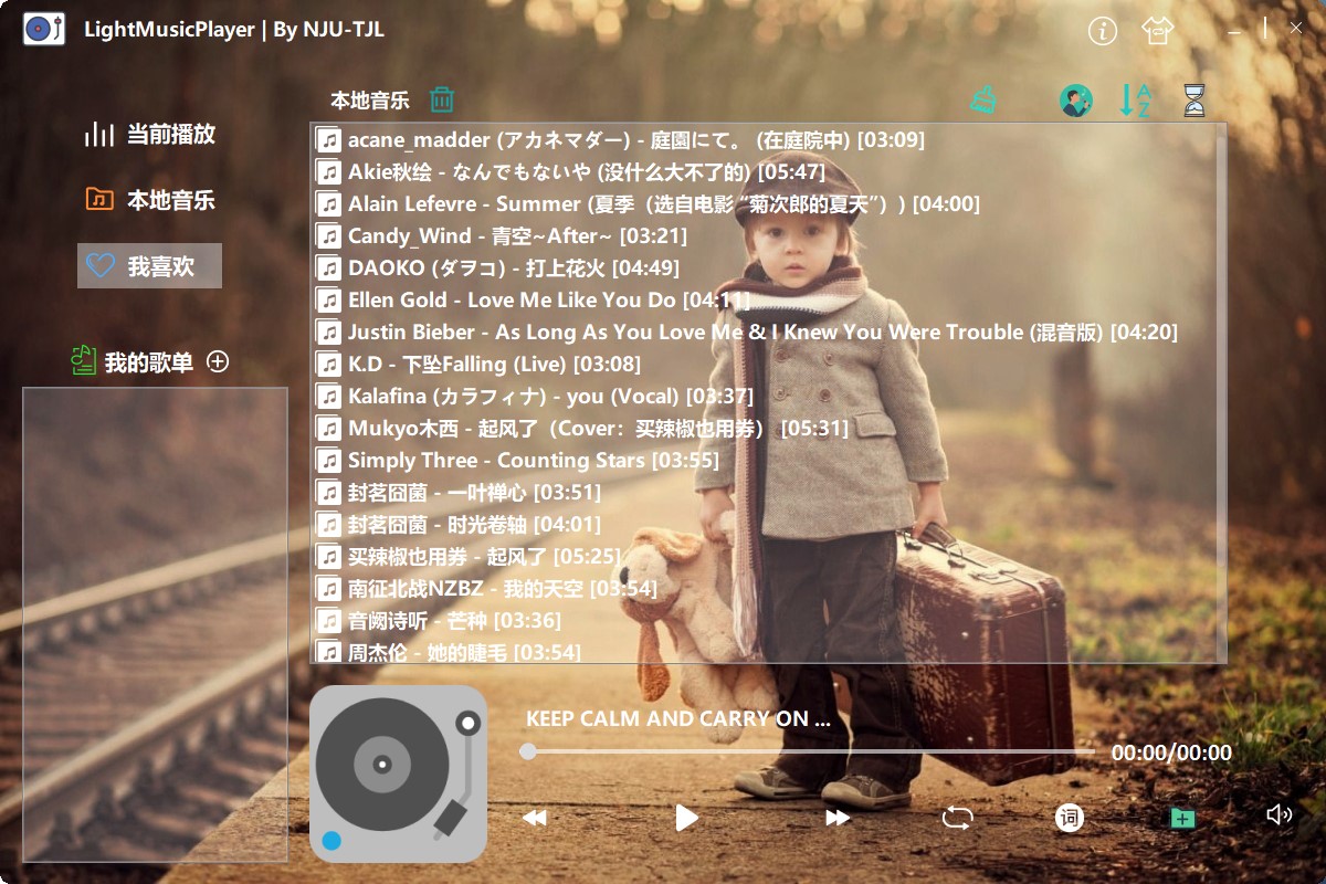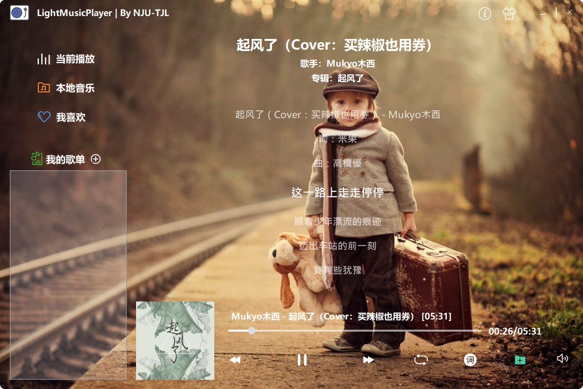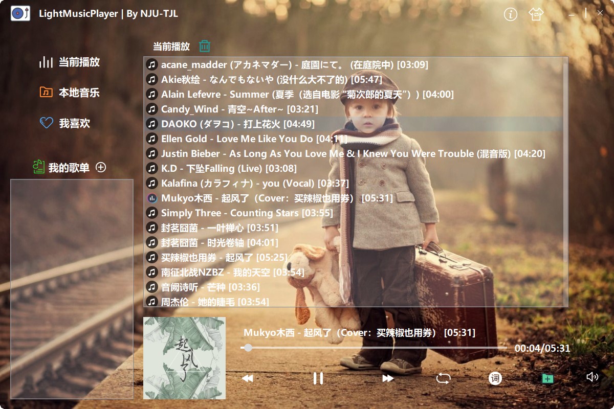 利用 Qt5 GUI 框架及其中的音频播放模块,完成了一个小巧、界面精美的本地音乐播放器。支持添加本地音乐、添加歌单、歌词查看、自定义背景、系统托盘控制播放等。同时,使用 SQLite 本地数据库保存已添加的音乐、歌单的信息,且使用.ini 文件记录应用设置信息。
