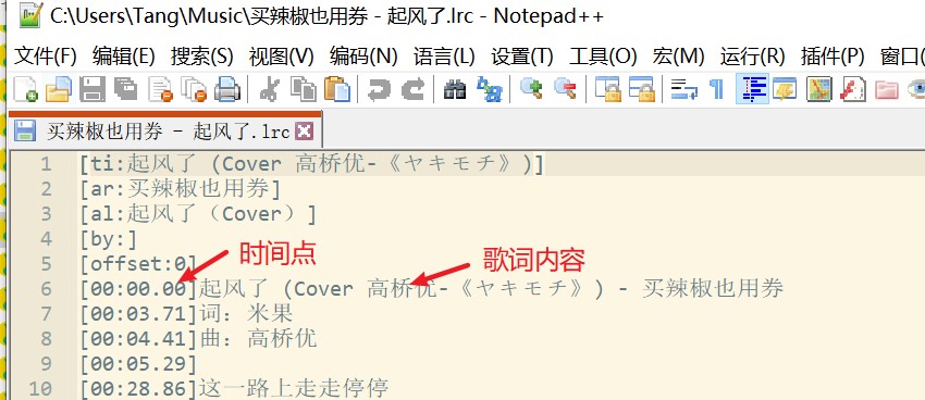 这里使用了 Qt 中的正则表达式来解析标准的 LRC 歌词文件,主要是需要识别出歌词的时间点,如下图。