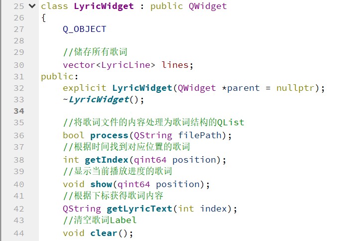 继承 QWidget,一个矩形区域,包含有用于显示歌词的几个文本框(QLabel),用于显示歌词。这里使用自定义的 Widget,也是便于独立使用一个.ui 文件进行界面设计。同时这样做,而不是在主窗口中直接显示歌词的文本框。也使得主窗口组件模块化,更加有条理。