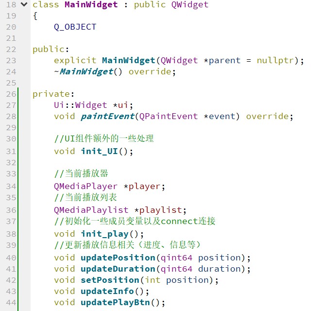 主窗口,用户直接交互的一个窗口组件。负责初始化、处理播放器相关事件、响应用户交互事件(点击、拖动等)等等工作。主要使用.ui 文件在 Qt 设计师中完成界面设计。