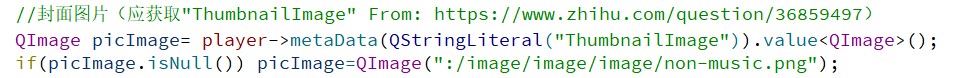 平时从 QQ 音乐等播放器上下载的 MP3 歌曲文件,在 Windows 资源管理器中查看的时候,会有图片显示(专辑图)。所以一开始猜想,歌曲的图片信息也是存储在 MP3 文件中,那 Qt 的库函数可以解析出来吗?最终,查阅手册和根据这个 找到了方法。只需要在解析歌曲文件时候,获取名为" ThumbnailImage"(缩略图)的元数据即可。